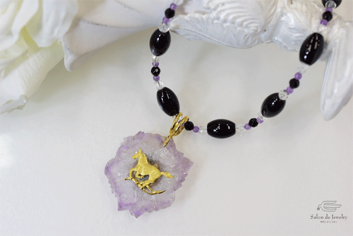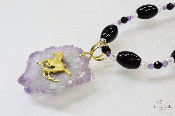 アメシストの中心を走るゴールド製の馬が優雅で絵画の様な雰囲気のペンダントネックレスです。